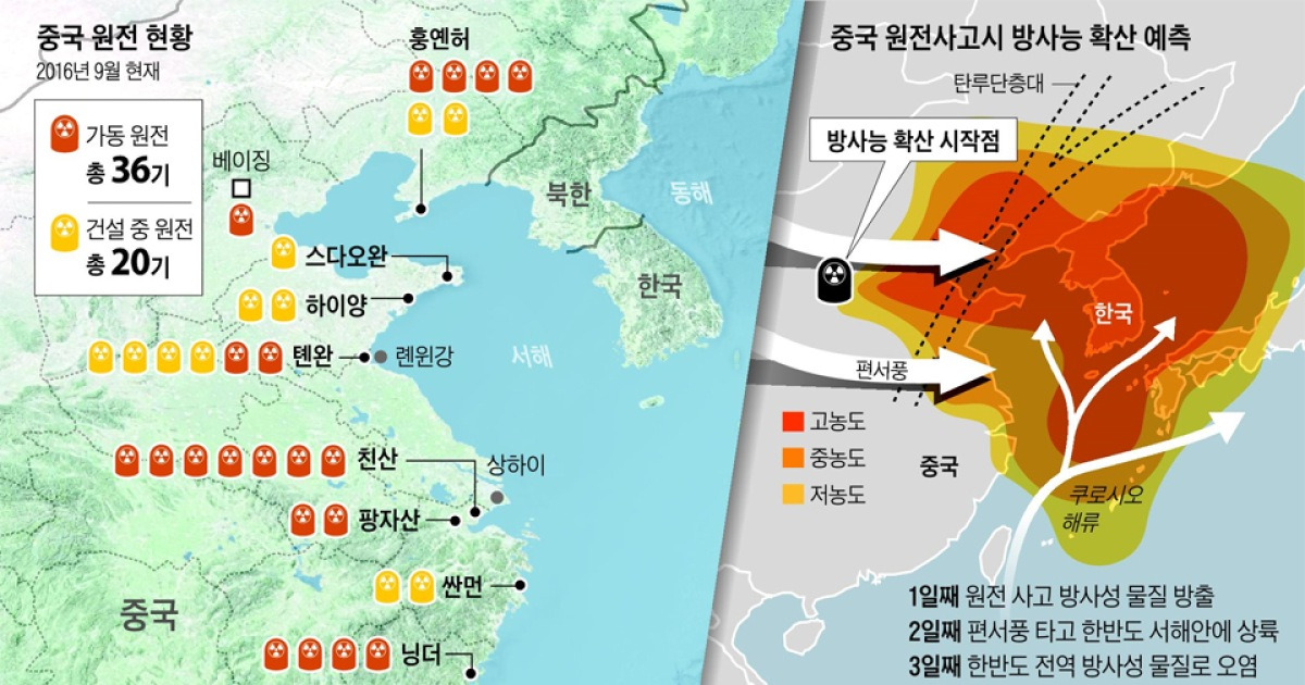중국의 원전 현황 중국은 현재 가동중인 원전 13기의 두 배가 넘는 27기의 원전을 건설중인데 그중에는 한국과 지리적으로 가까운 산둥(山東) 반도에 위치한 하이양(海陽) 1, 2호기와, 북한과 접경하고 있는 랴오닝성 랴오둥(遼東) 반도의 홍옌허(紅沿河) 1, 2, 3, 4호기도 포함돼 있다. 중국 당국은 문제없다는 입장이지만 전문가들의 의견은 엇갈립니다. 2019년 5월을 기준으로, 전 세계 운행 중인 원전의 24.2%(109기)와 건설 중인 원전의 32.7%(18기)가 한중일 삼국에 집중되어 있다. 산동성 하이양에서 원전 사고가 일어난다면 당연히 가장 먼저 피해를 입는 것은 산동성에 살고 있는 중국 사람들이다. 중국 정부망에 따르면 국무원 (중앙정부)은 '원전 표준화 업무 강화와 관련된 지도의견'을 9일 발표했다.